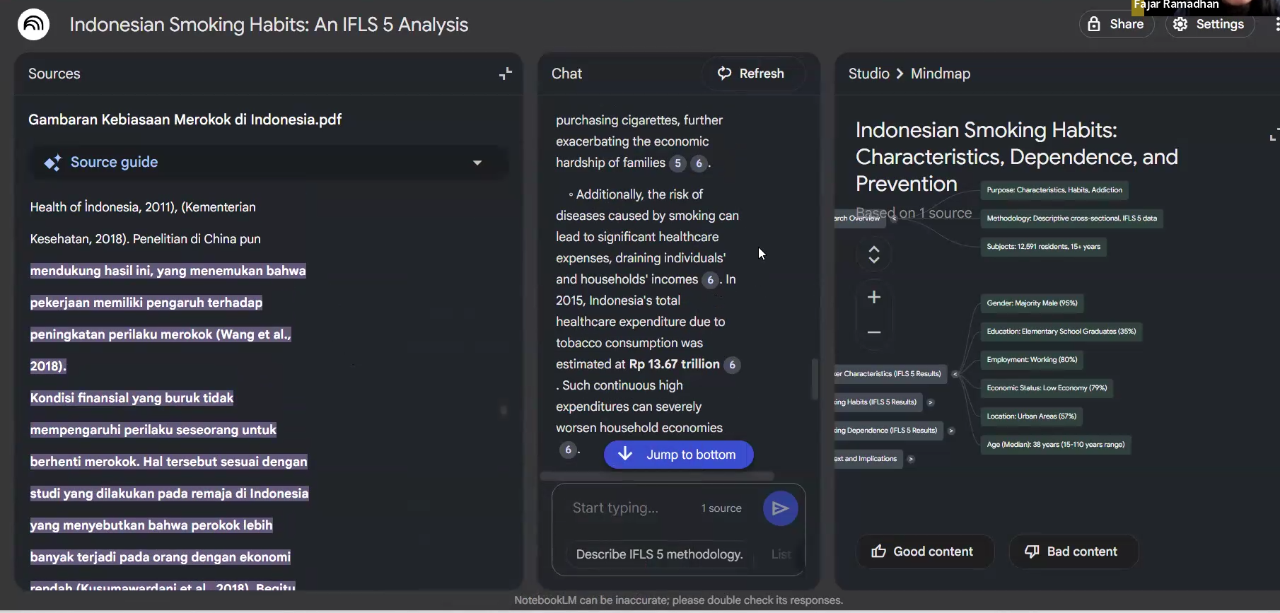Setelah dokumen yang relevan diunggah ke NotebookLM dalam satu notebook, NotebookLM menganalisis seluruh sumber dan menghasilkan ringkasan awal serta pertanyaan-pertanyaan kunci yang relevan. Dari sini, tim penulis naskah bisa mulai mengajukan pertanyaan yang terarah, dan NotebookLM akan menjawab dengan presisi, sambil menunjukkan persis di bagian mana jawaban itu berasal.